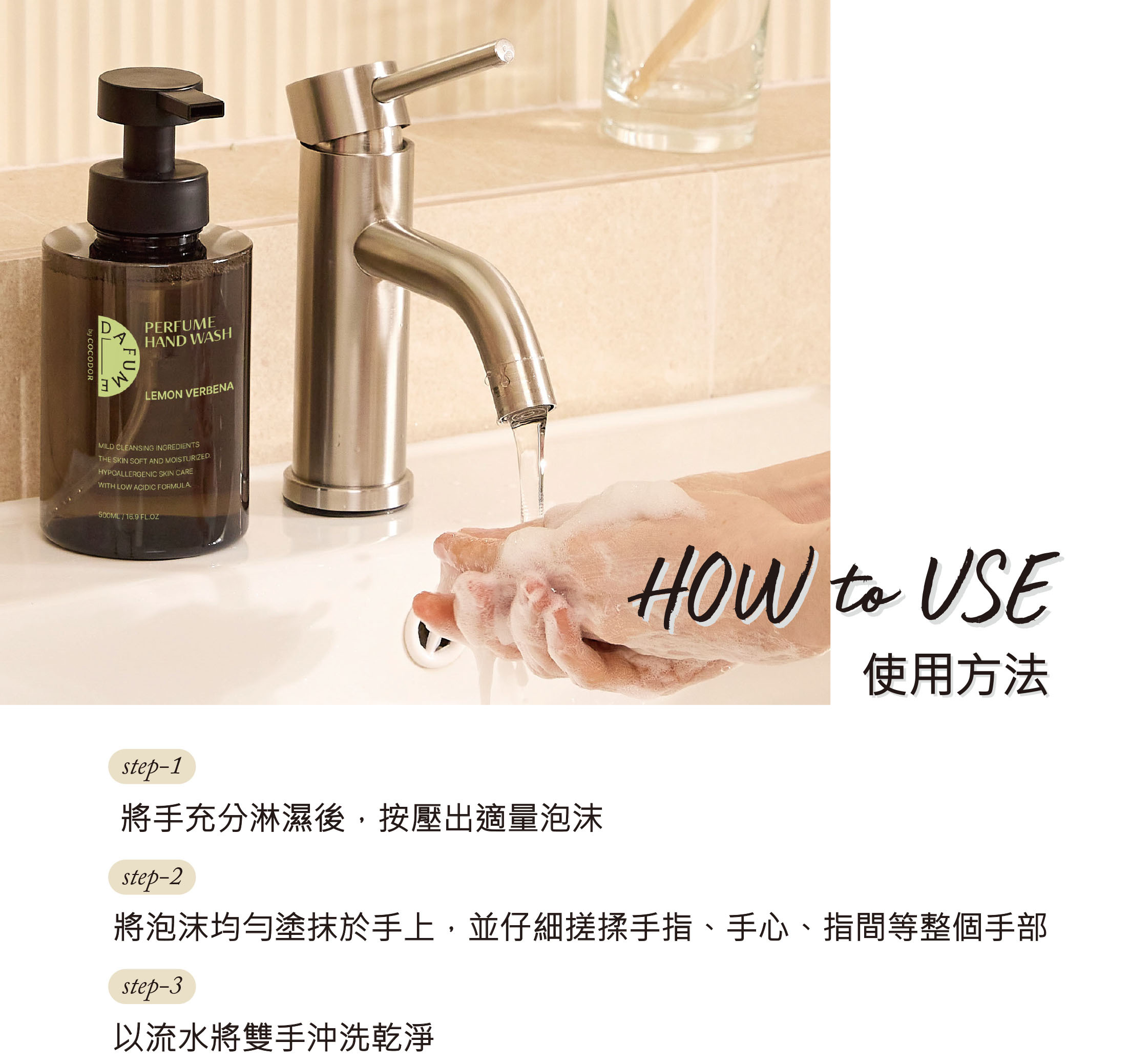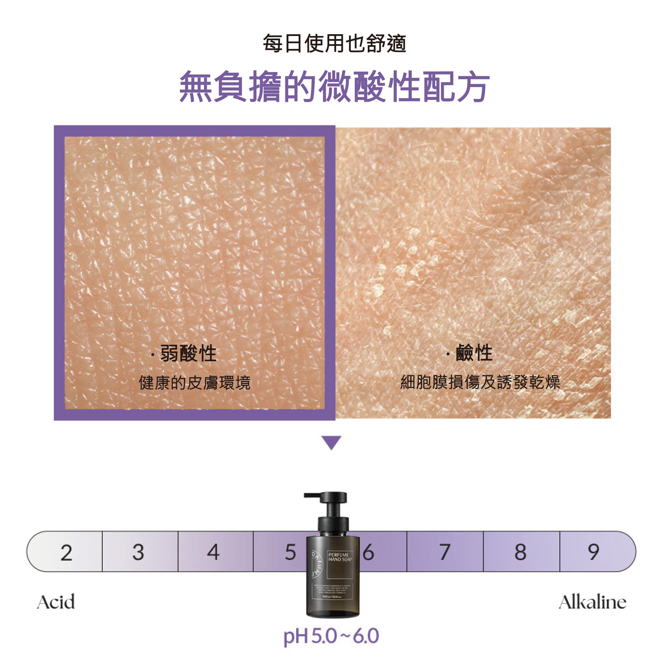 柔軟且豐富的泡沫徹底洗淨,不刺激肌膚,清洗後仍能保持水潤,給予肌膚保濕、營養、鎮定護理,幫助維持油水平衡,持續散發具高級感的隱約香氣。